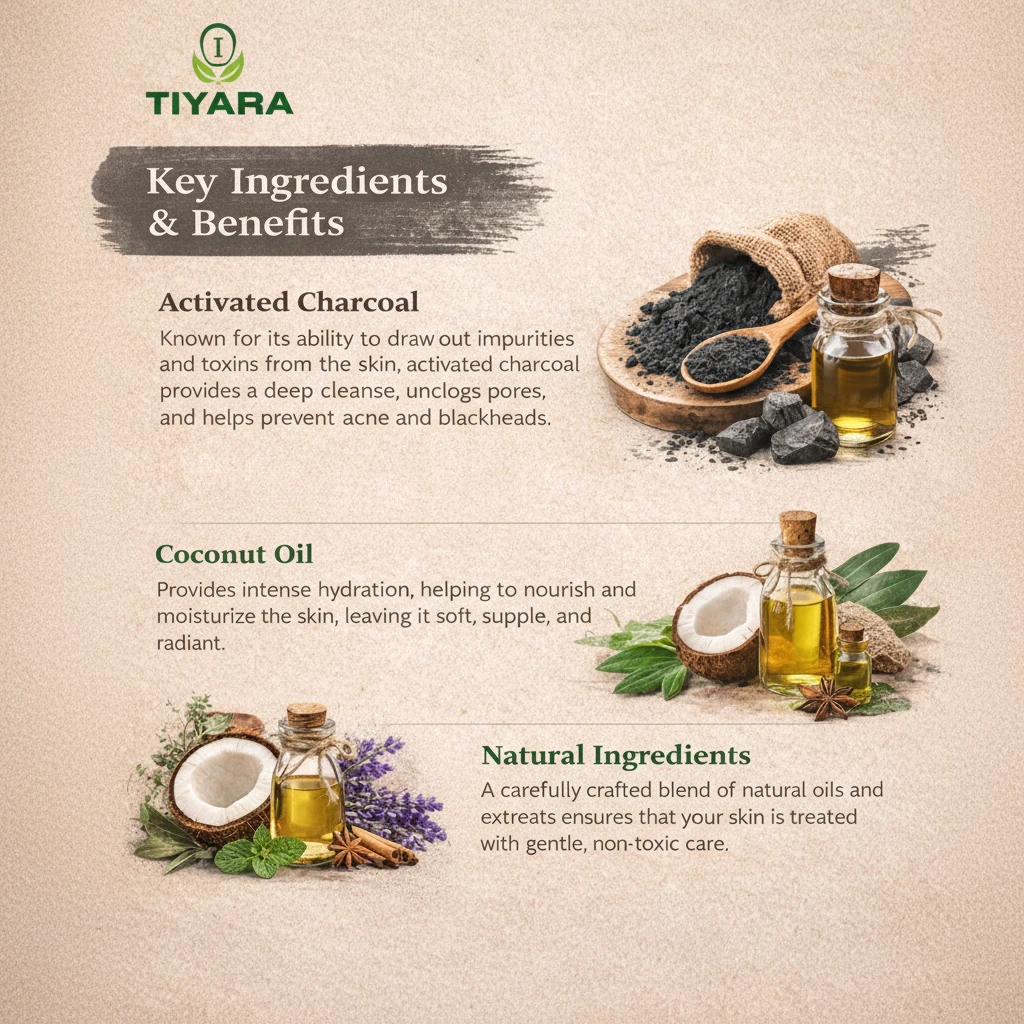 - Activated Charcoal: Known for its ability to draw out impurities and toxins from the skin, activated charcoal provides a deep cleanse, unclogs pores, and helps prevent acne and blackheads.